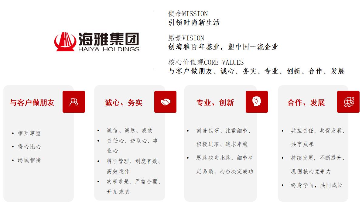 海雅集团的企业文化由使命、愿景、核心价值观组成。核心价值观是指导所有海雅人行动的圣经,它能够凝聚组织与团队的力量,保证所有海雅人在共同使命的指引下,以一致的步调、统一的行动向着愿景前进。