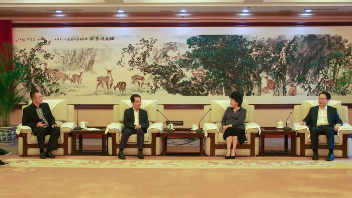 ▲国务院侨办主任裘援平(右)与涂辉龙董事长(左)进行座谈