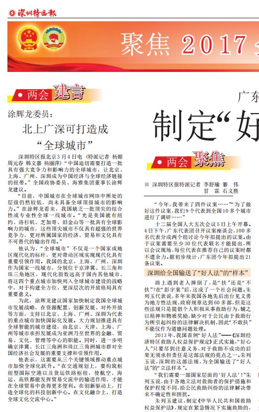 “中国迫切需要打造一批具有强大竞争力和影响力的全球城市,让北京、上海、广州、深圳成为中国经济与全球经济链接的纽带。”全国政协委员、海雅集团董事长涂辉龙建议。