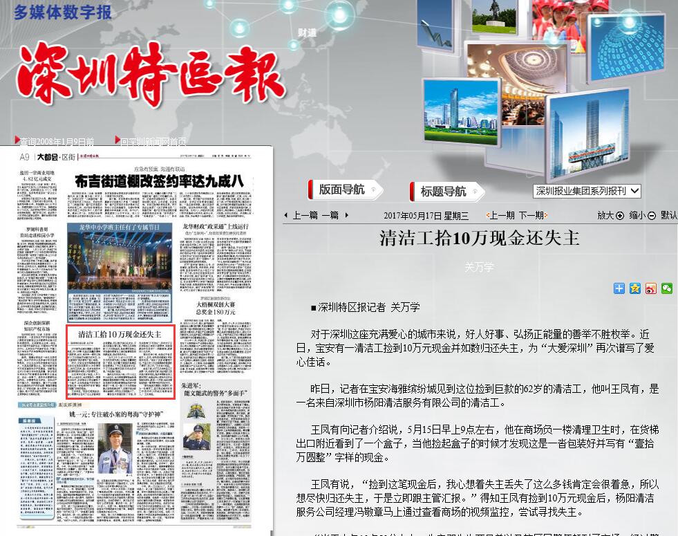 深圳特区报|拾金不昧 弘扬正能量——宝安海雅缤纷城清洁工拾10万现金还失主