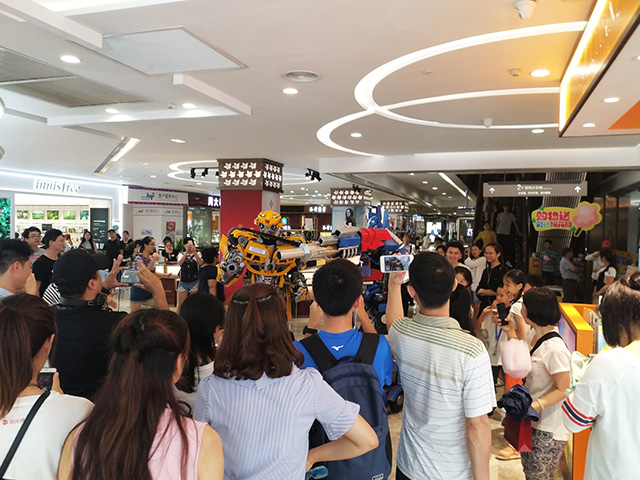 最夺人眼球的非变形金刚巡演莫属了,整个海雅缤纷广场的气氛随着变形金刚的巡游达到顶峰!2米多高的擎天柱和大黄蜂蓄势待发,好像时刻准备变形,所到之处都呈现人山人海的局面,好不壮观!合影,互动似乎都不足以表达顾客对变形金刚的的热情!