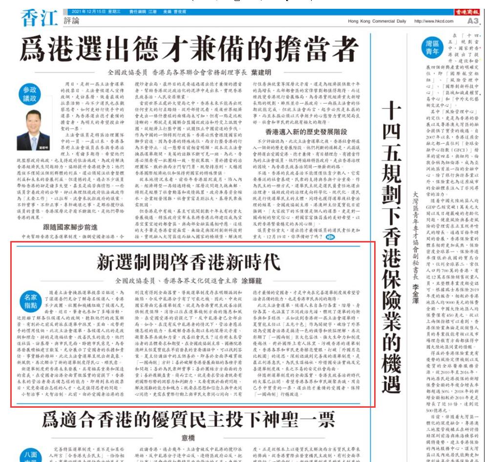 伴随新选举制度的全面落实,香港良政善治新时代的大幕已拉开。希望香港各界和市民凝聚共识,用自己手中宝贵的一票,选出德才兼备的爱国者,保障“一国两制”行稳致远。